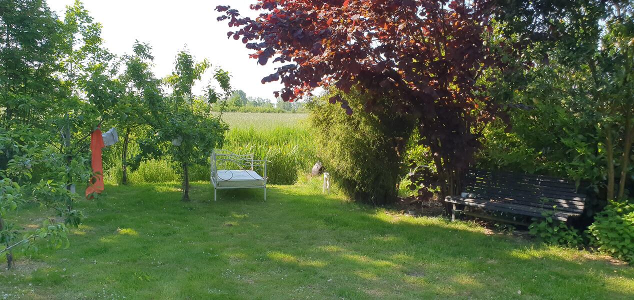 Grote tuin met veranda in de zak van Zuid-Beverland. Er zijn kippen en je kunt zelf eitjes rapen. Kamperen of overdekt overnachten in een klein schuurtje. Vuurtje stoken aan de slootkant en BBQ.
